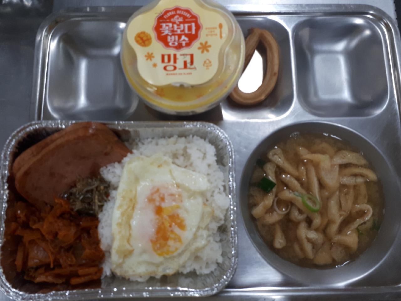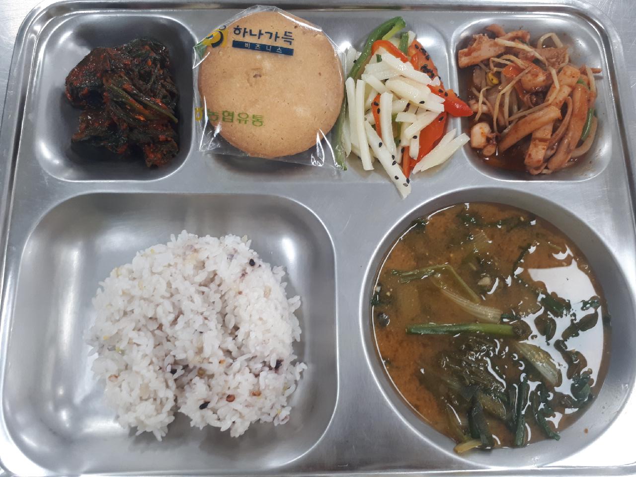석식 : 혼합잡곡밥, 올갱이된장국, 감자채피망볶음, 오징어콩나물불고기, 배추김치, 쿠키