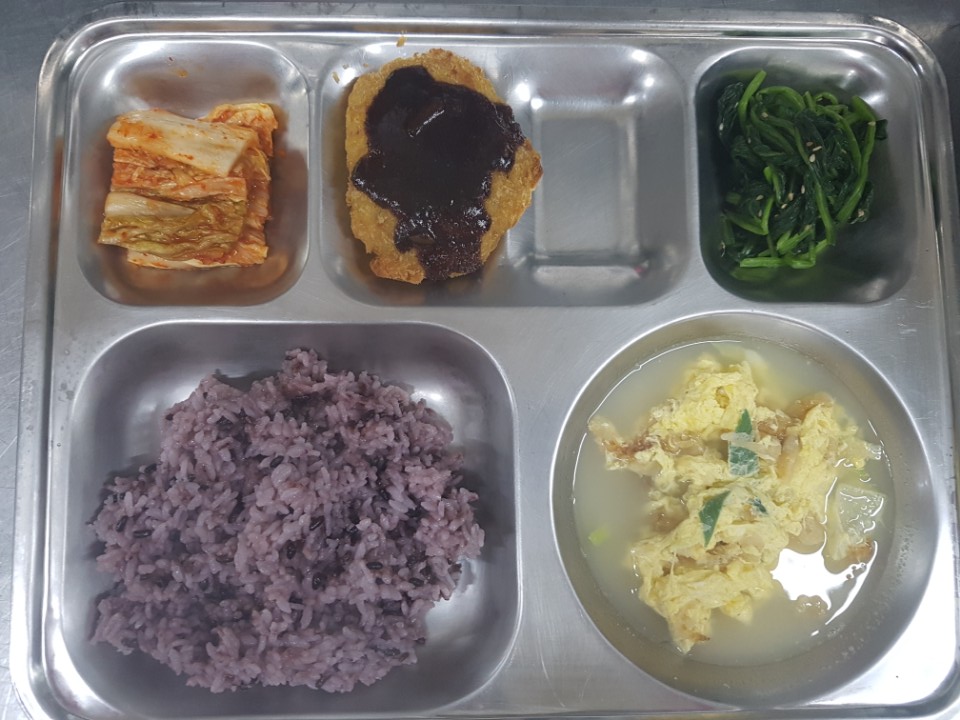 조식 : 흑미밥, 북어계란국, 멘치카츠/스테이크소스, 시금치나물, 배추김치