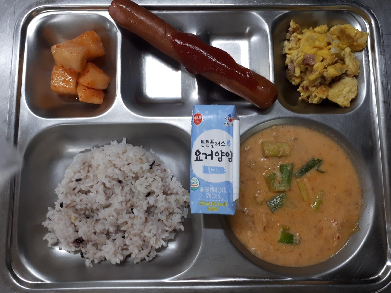 석식 : 혼합10곡밥, 콩비지찌개, 부어스트오븐구이, 양송이스크램블, 열무김치, 요거얌얌
