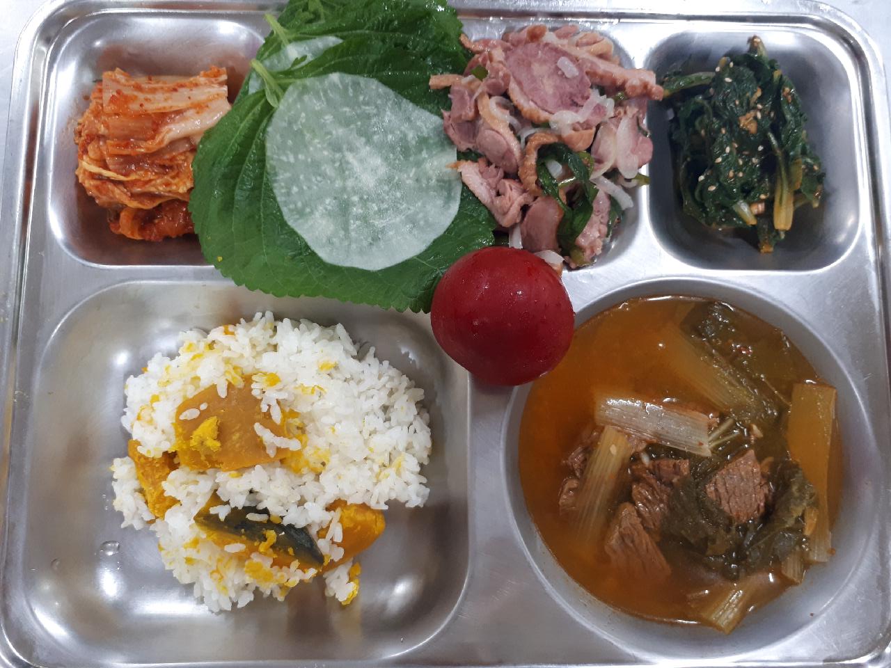 중식 : 단호박밥, 소고기배추국, 오리훈제, 근대고추장무침, 깻잎/무쌈, 자두