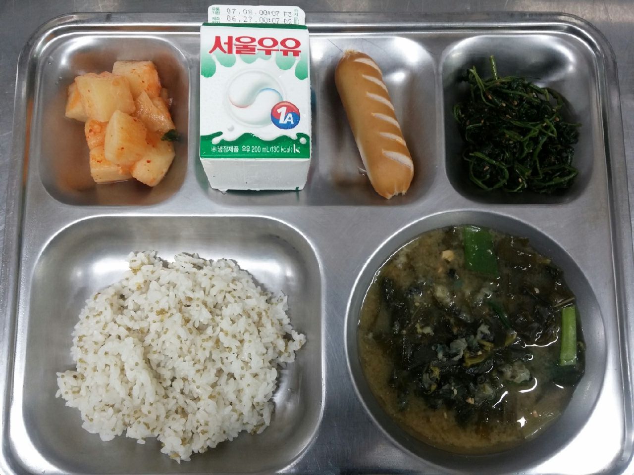 조식 : 차조밥, 아욱올갱이국, 치즈부어스트, 고춧잎고추장나물, 깍두기, 우유