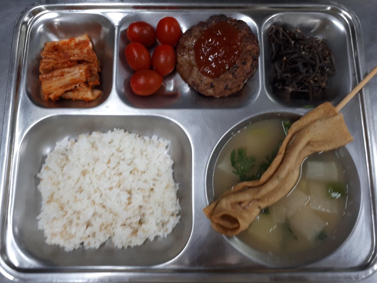 석식 : 발아현미밥, 꼬치어묵국, 우엉콩조림, 오징어찹스테이크/살사소스, 배추김치, 방울토마토