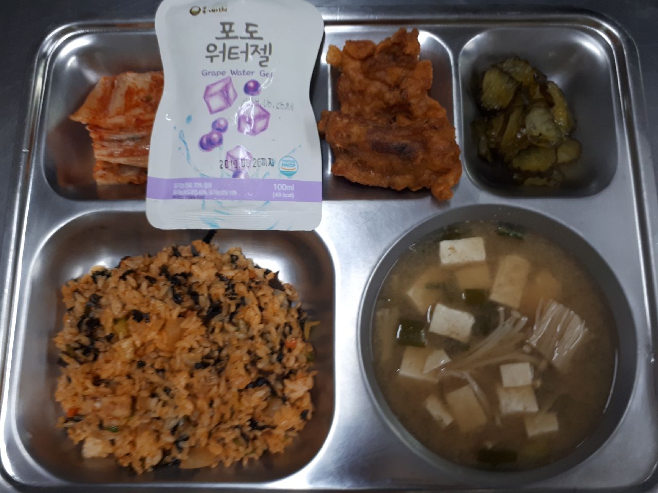 중식 : 짬뽕볶음밥, 팽이버섯미소국, 점보닭다리후라이드, 오이피클, 배추김치, 워터젤리