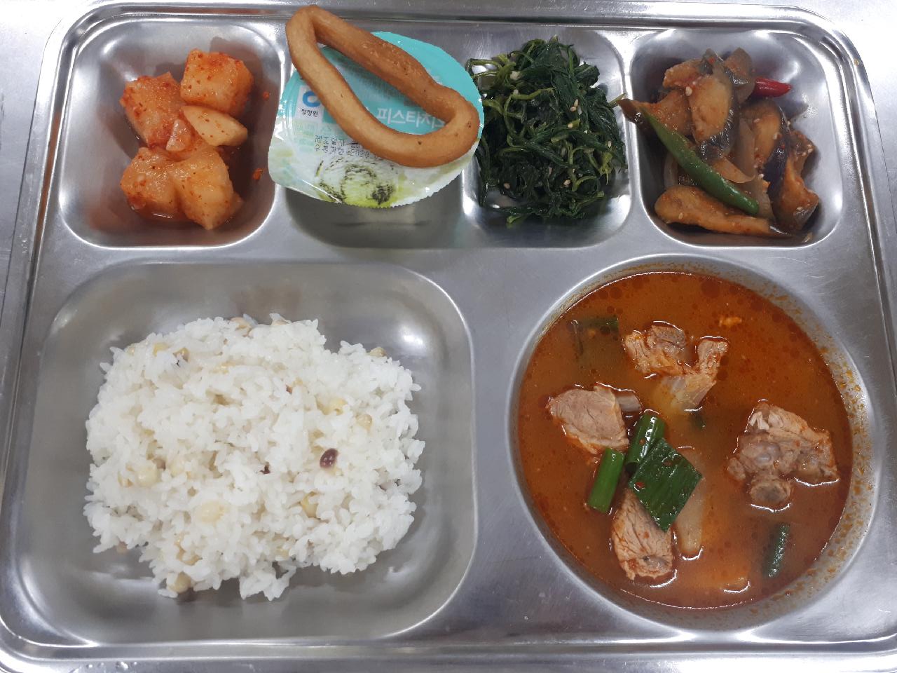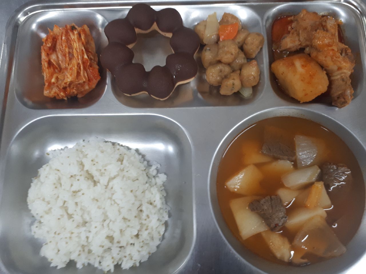 석식 : 차조밥, 표고감자찌개, 닭볶음탕, 우엉어묵양파볶음, 배추김치, 초코찰링도넛