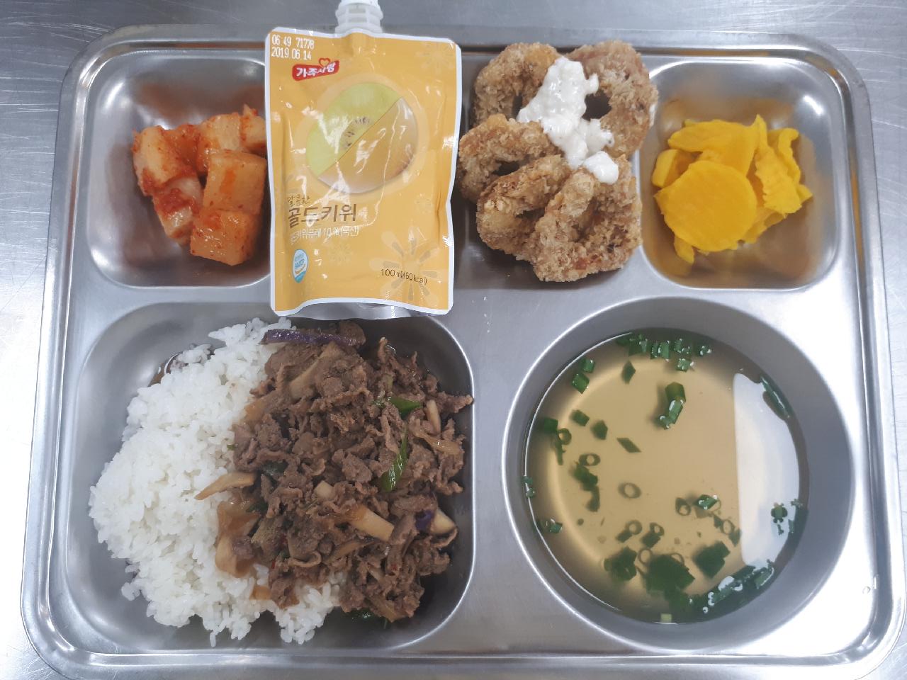 중식 : 오리불고기덮밥, 맑은우동국, 치자단무지, 깍두기, 오징어링튀김/락교드레싱, 골드키위쥬스