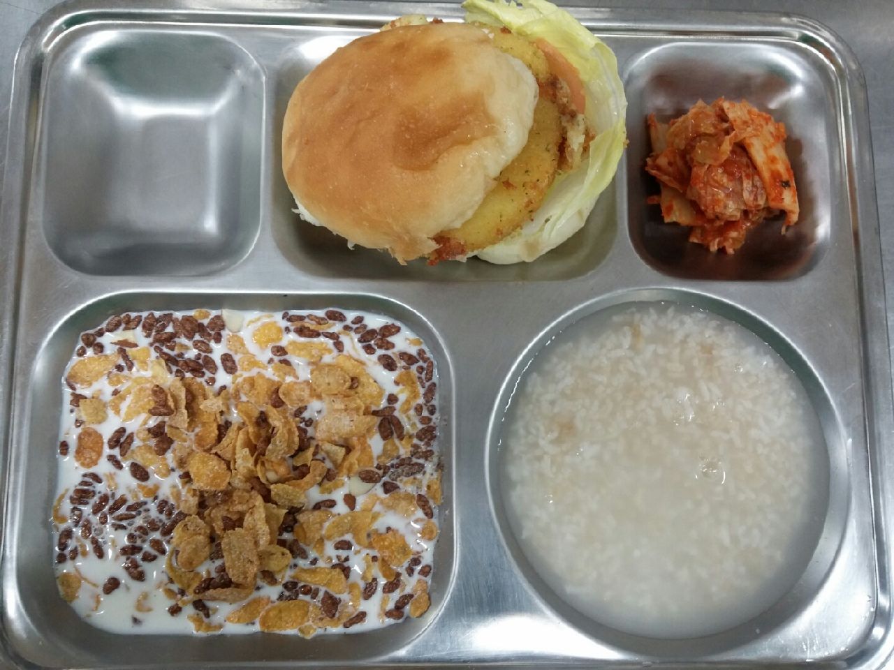 조식 : 리얼치즈버거, 씨리얼/우유, 숭늉/배추김치