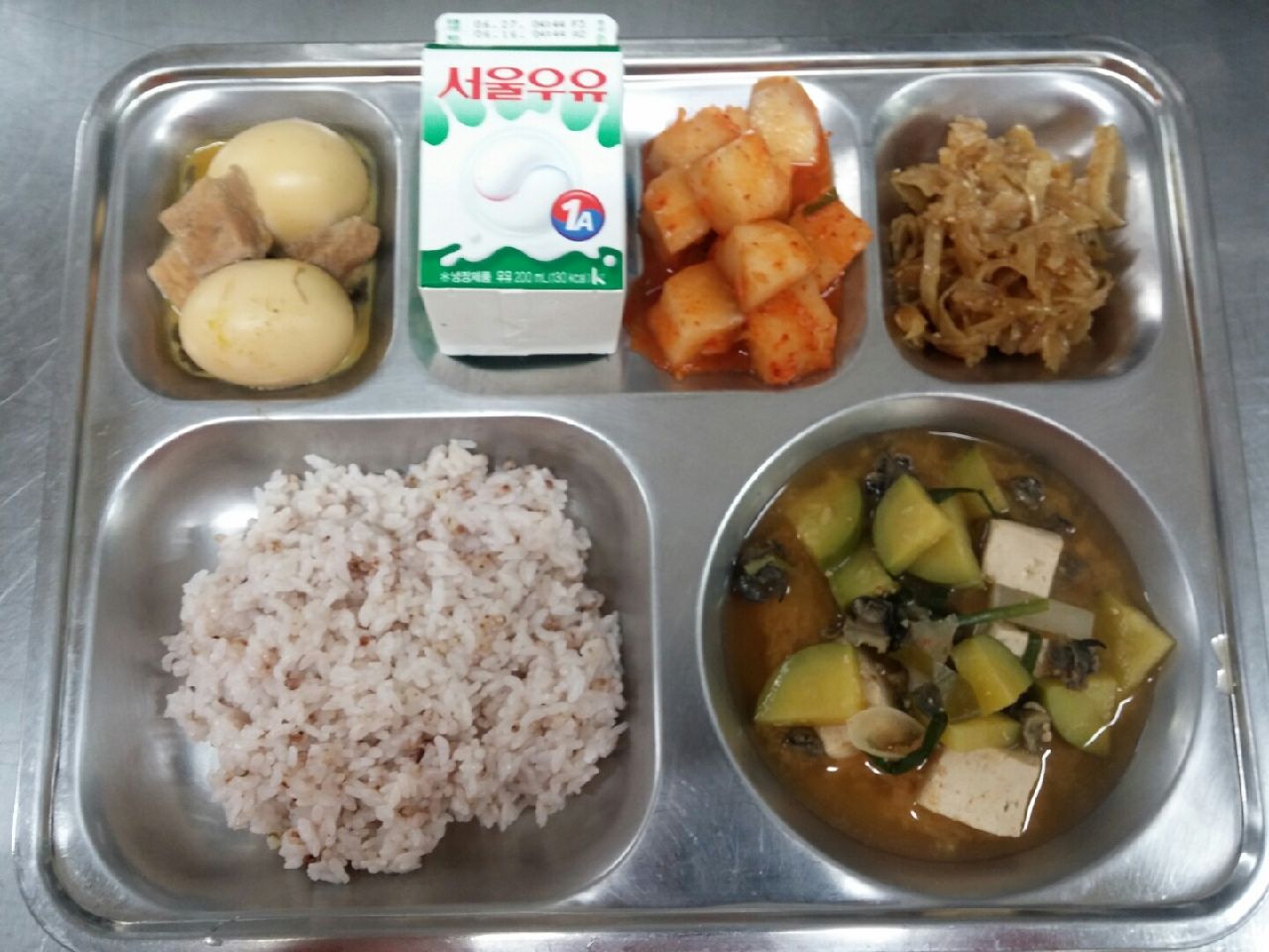 조식 : 수수밥, 우렁된장찌개, 계란돈장조림, 명엽채볶음, 깍두기, 우유
