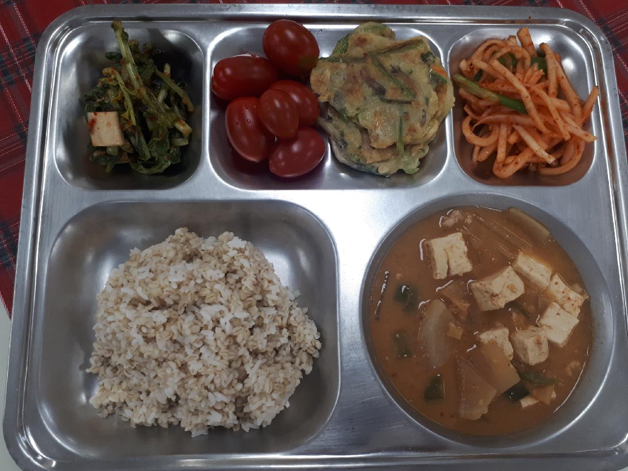 중식 : 꽁보리밥/고추장, 청국장찌개, 무생채, 버섯야채전, 열무김치, 방울토마토