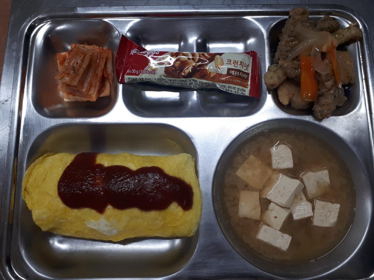 석식 : 햄오므라이스/케첩소스, 미소된장국, 탕수육, 배추김치, 에너지바