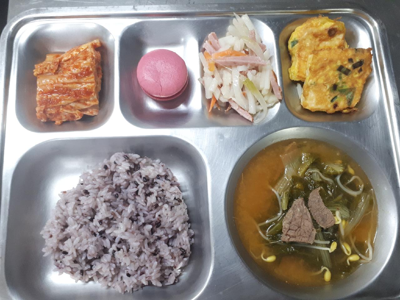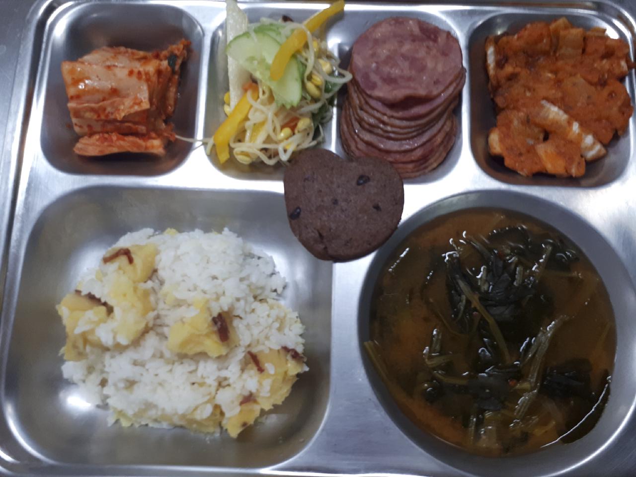 석식 : 흑미밥, 사골우거지국, 두부계란전, 감자채햄볶음, 배추김치, 마카롱