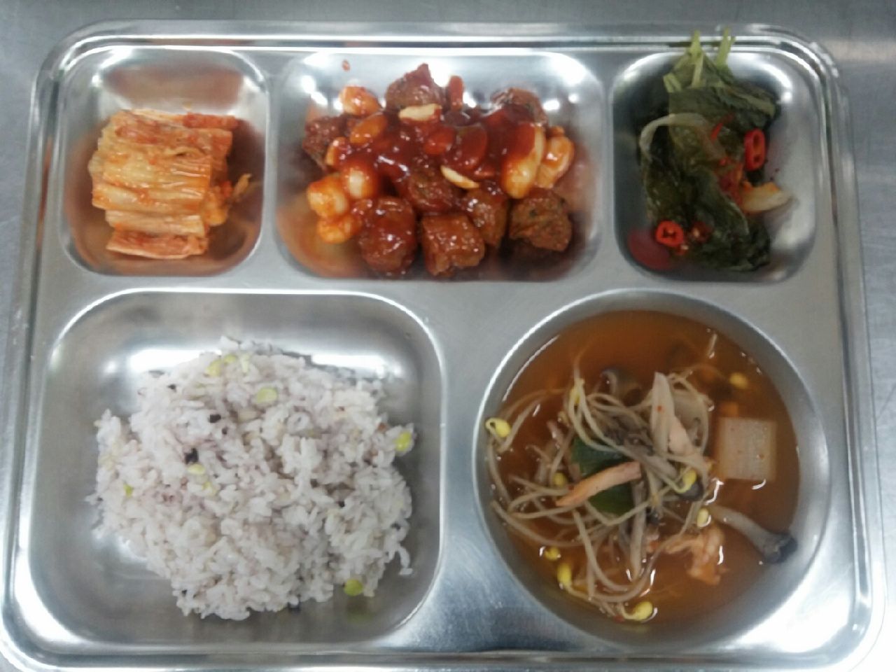 조식 : 혼합잡곡밥, 오징어느타리국, 미트볼떡강정, 깻잎찜, 배추김치