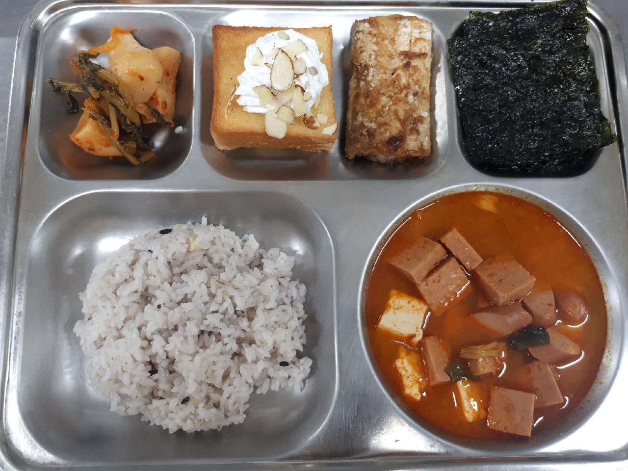 석식 : 혼합잡곡밥, 햄고추장찌개, 갈치구이, 구이김, 배추김치, 미니허니브래드