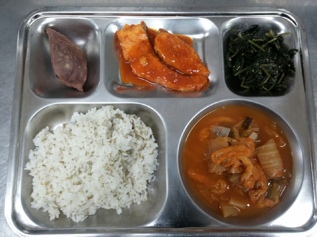 조식 : 차조밥, 유부김치국, 매콤슈비드연어스테이크, 깻순나물, 배추김치, 꿀고구마, 우유