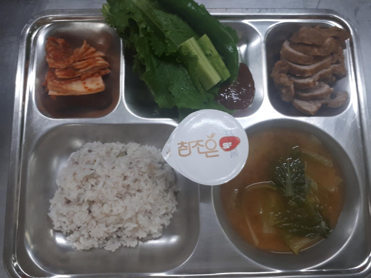 중식 : 혼합잡곡밥, 애배추된장국, 오향장육, 상추야채스틱/쌈장, 배추김치, 청포도소르베