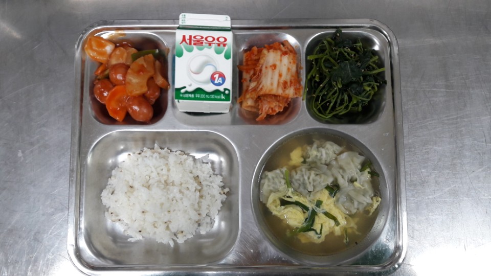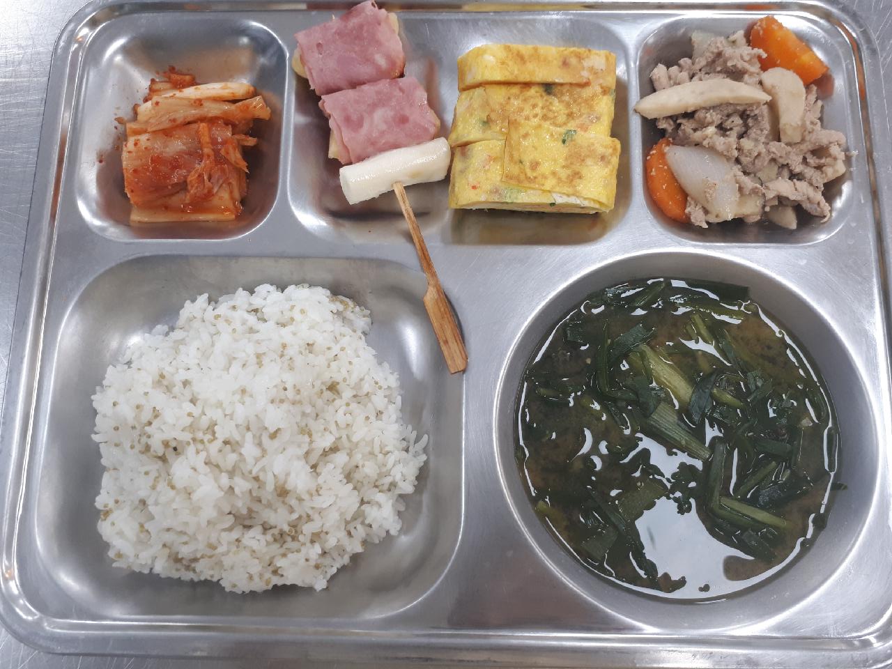 조식 : 율무밥, 물만두계란탕, 비엔나파인애플조림, 시금치나물, 배추김치, 우유