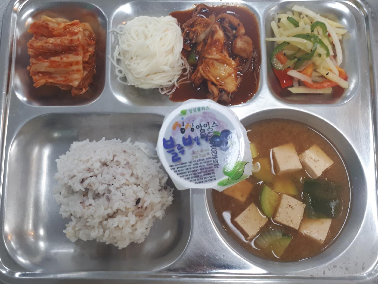 중식 : 혼합잡곡밥, 호박두부된장국, 주꾸미볶음과 소면, 감자채피망볶음, 배추김치, 아이스블루베리