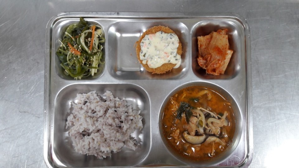 조식 : 혼합잡곡밥, 버섯돈육찌개, 새우까스/탈탈소스, 미역줄기팽이볶음, 배추김치