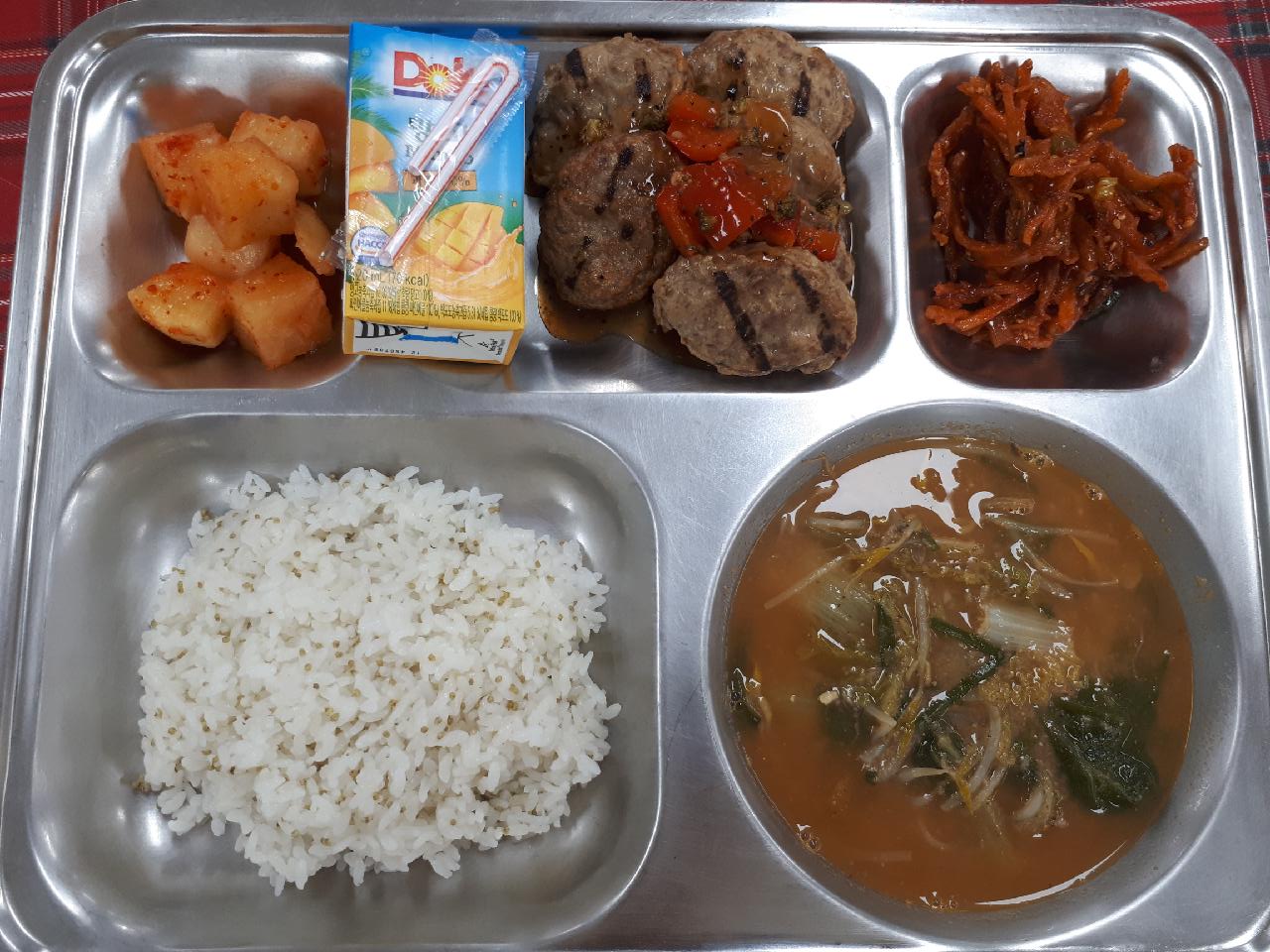 중식 : 차조밥, 추어탕, 치킨스테이크/페퍼소스, 오징어채볶음, 깍두기, 돌망고쥬스