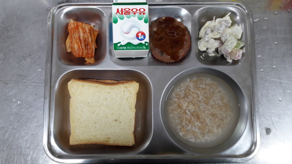 조식 : 식빵/쨈, 조랑떡함박/스테이크소스, 월도프샐러드, 우유, 숭늉/배추김치