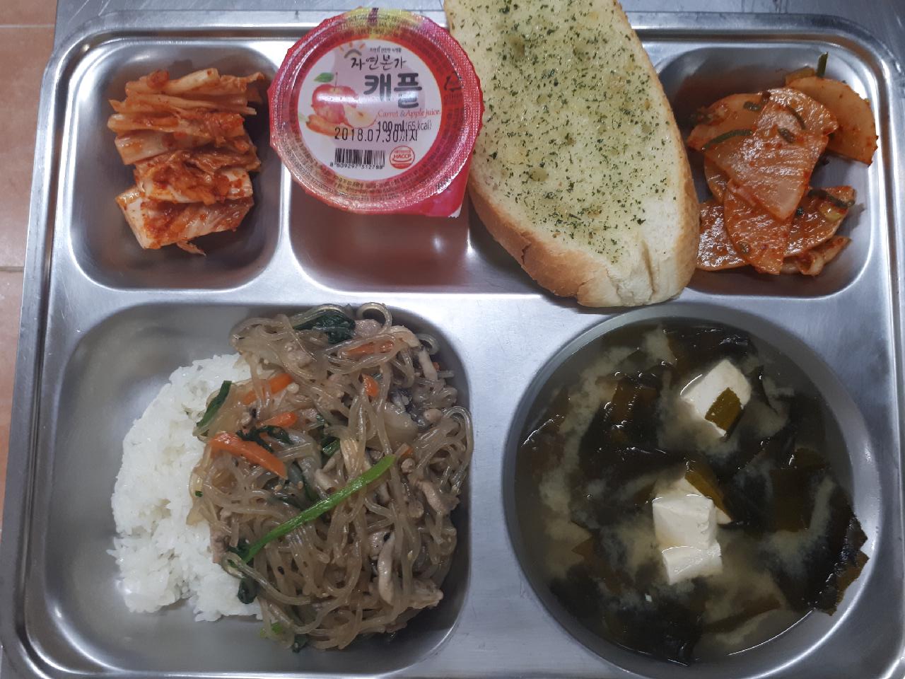 석식 : 잡채덮밥/간장, 미소시루, 단무지무침, 배추김치, 갈릭바게트, 캐플쥬스