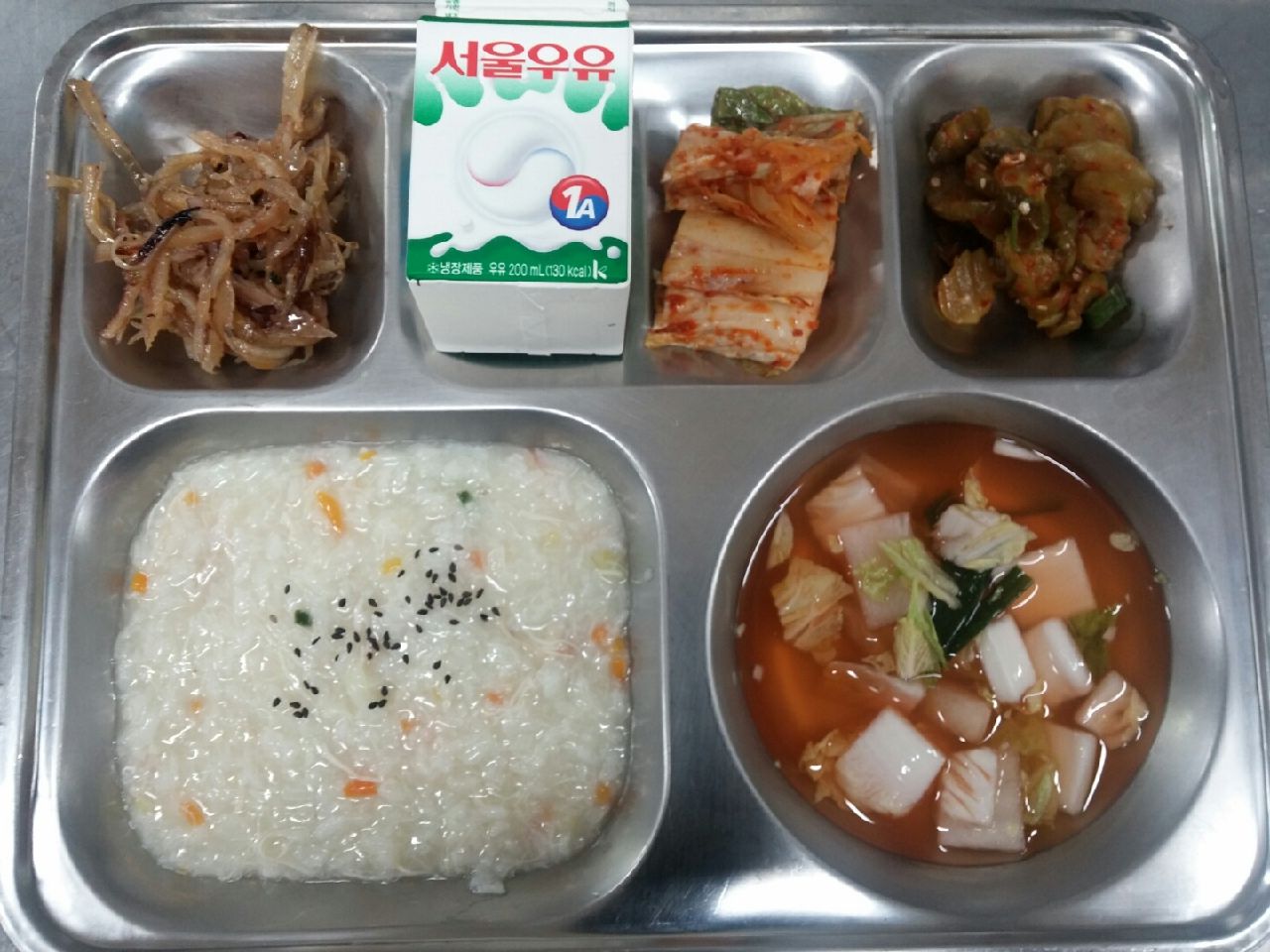 조식 : 닭죽, 나박김치, 진미채간장조림, 오이장아찌무침, 배추김치, 우유