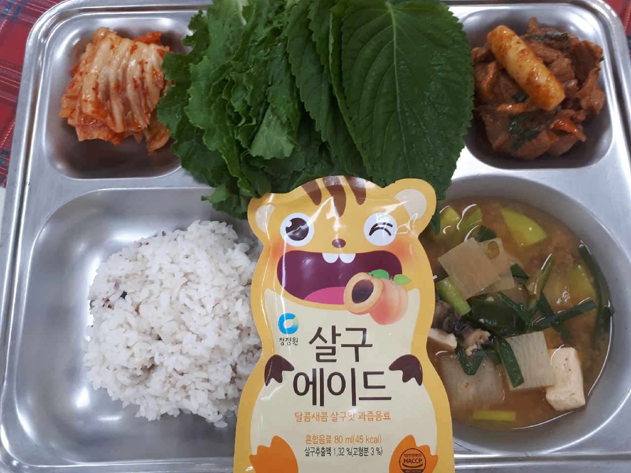 중식 : 혼합잡곡밥, 우렁된장찌개, 오리불고기, 상추,깻잎쌈/쌈장, 배추김치, 살구에이드