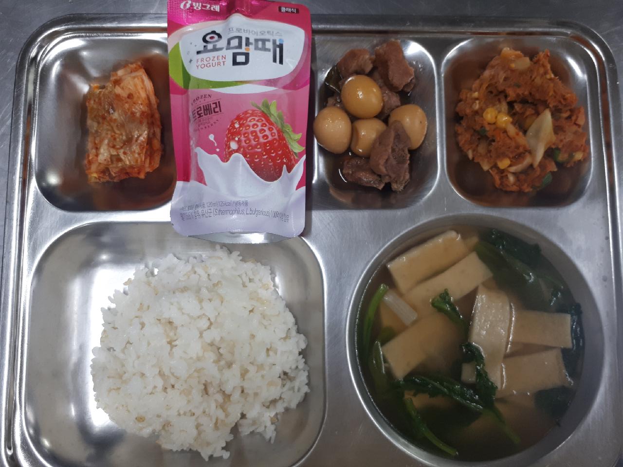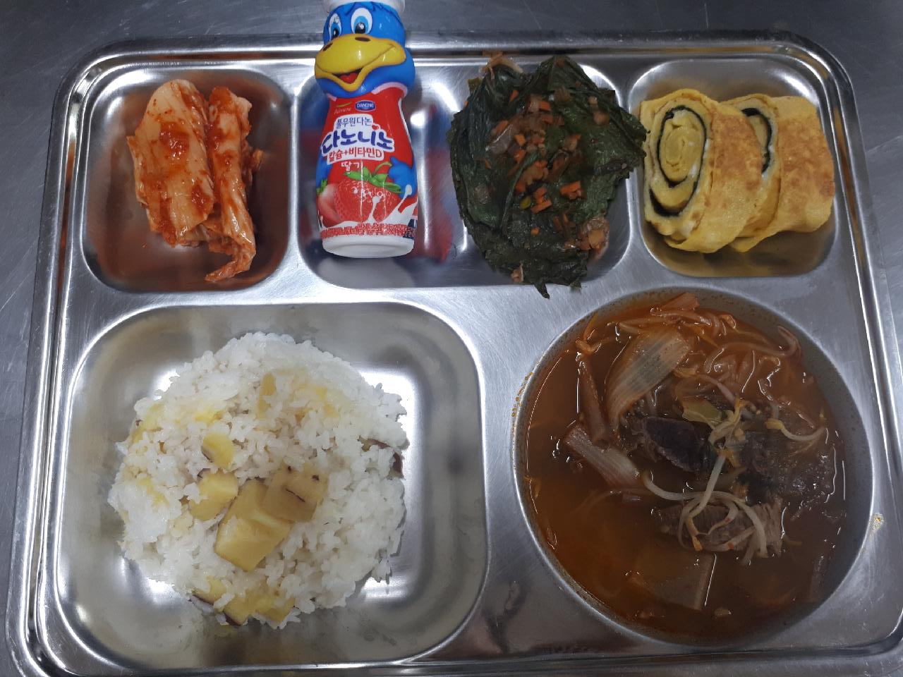 중식 : 고구마밥, 육개장, 김계란말이, 깻잎찜, 배추김치, 다노니노딸기요거트