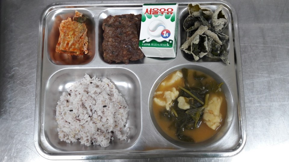 조식 : 혼합잡곡밥, 아욱수제비국, 제주돼지떡갈비, 다시마부각, 배추김치, 우유