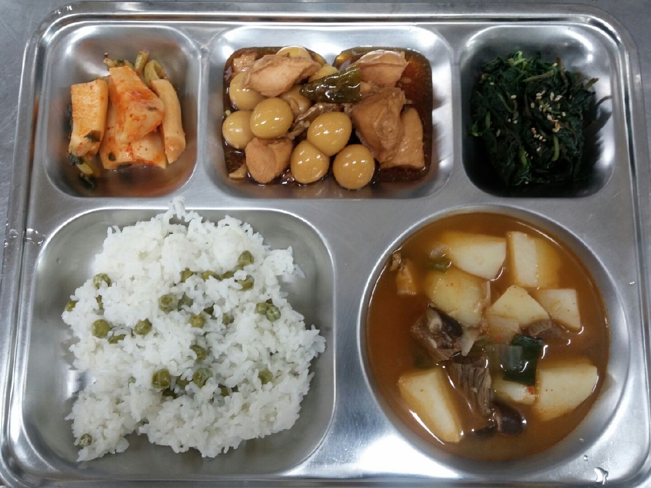 조식 : 완두콩밥, 표고감자찌개, 닭가슴살장조림, 깻순나물, 깍두기
