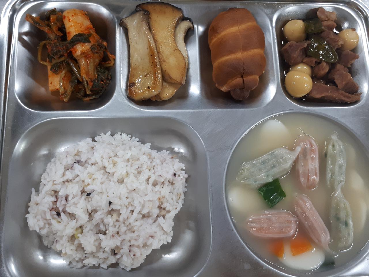 석식 : 혼합잡곡밥, 꼬물이만두떡국, 메알돈장조림, 새송이버섯구이, 깍두기, 트위스트핫도그/케찹