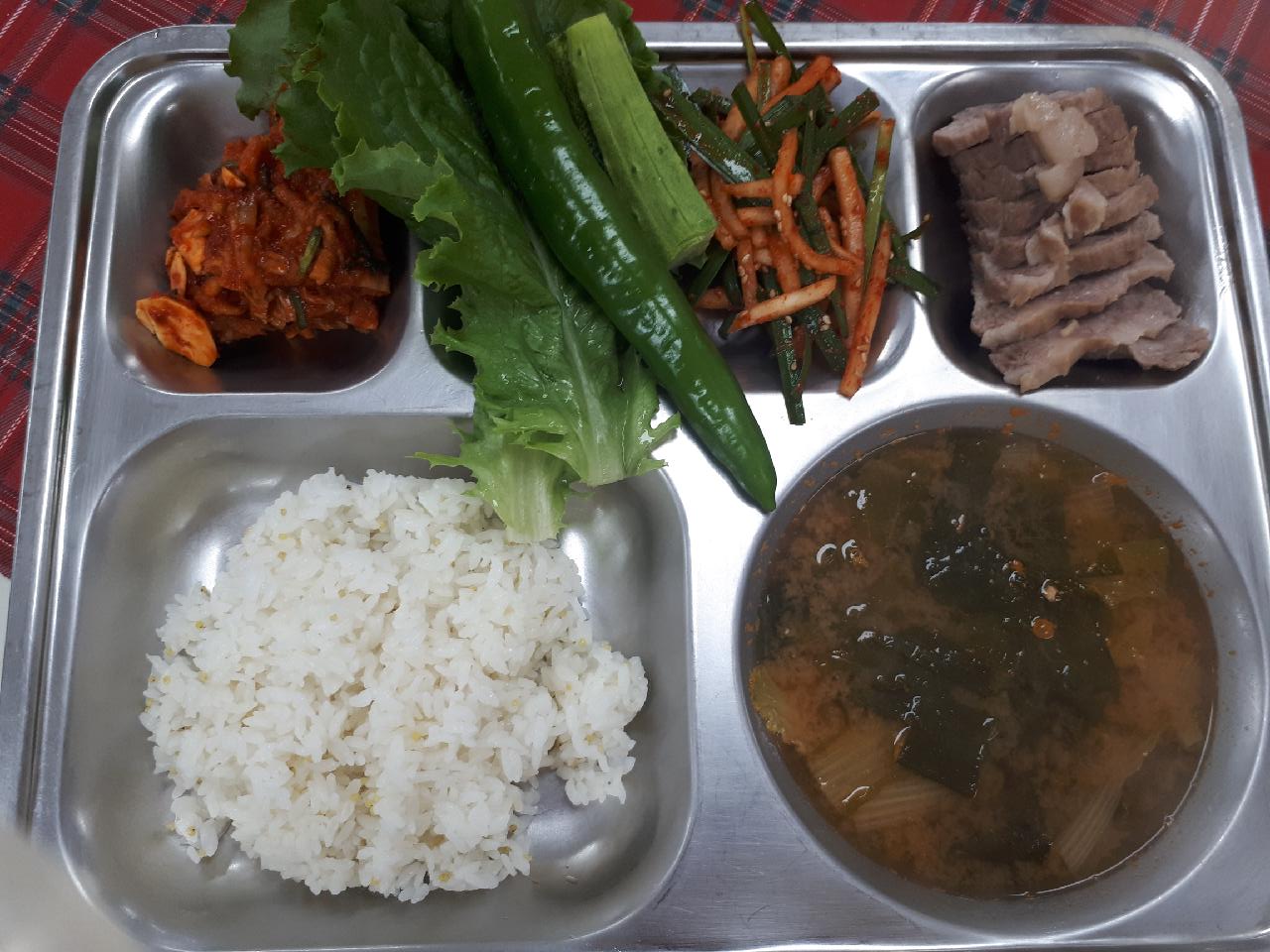 중식 : 기장밥, 얼갈이된장국, 보쌈/새우젓, 부추무생채, 상추야채스틱/쌈장, 보쌈김치