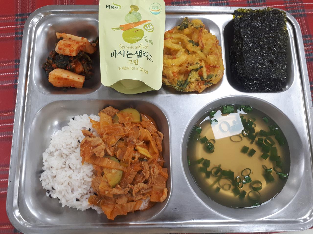 중식 : 돈육김치덮밥, 맑은우동국, 구이김, 깍두기, 야채튀김, 마시는샐러드