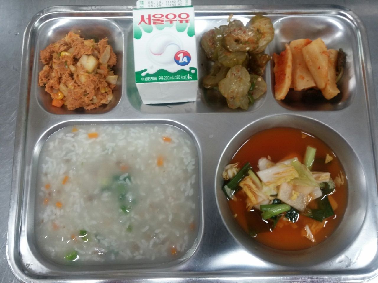 조식 : 소고기야채죽, 나박김치, 고추참치야채볶음, 오이장아찌무침, 깍두기, 우유