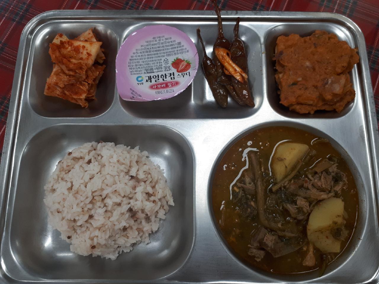 중식 : 수수밥, 돈등뼈우거지탕, 오징어김치전, 고추지무침, 깍두기, 스무디
