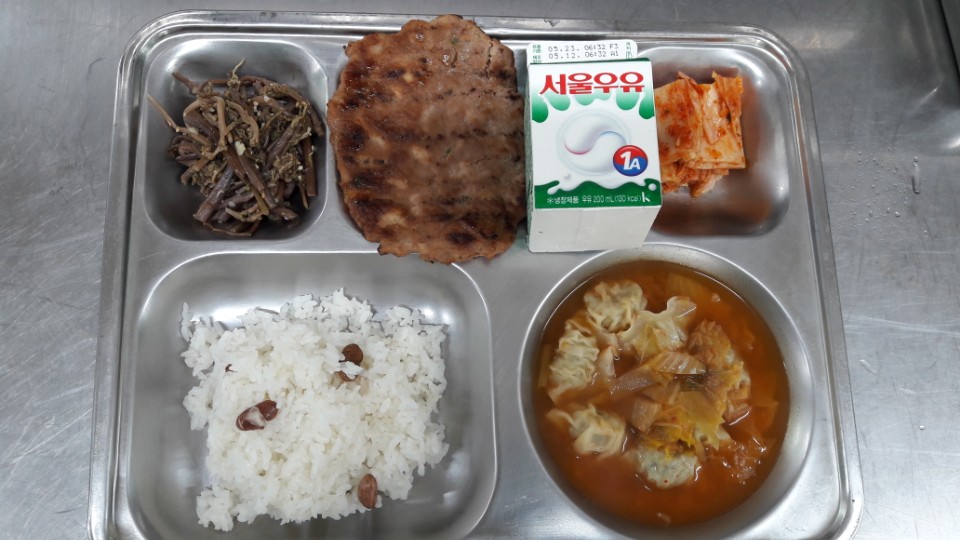 조식 : 강낭콩밥, 만두김치국, 언양식바싹불고기, 고사리나물, 배추김치, 우유