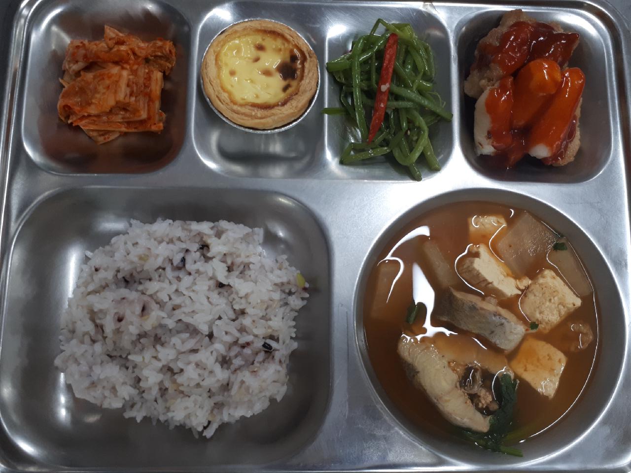 석식 : 혼합10곡밥, 동태찌개, 닭살치즈떡강정, 고구마순볶음, 패스츄리에그타르트