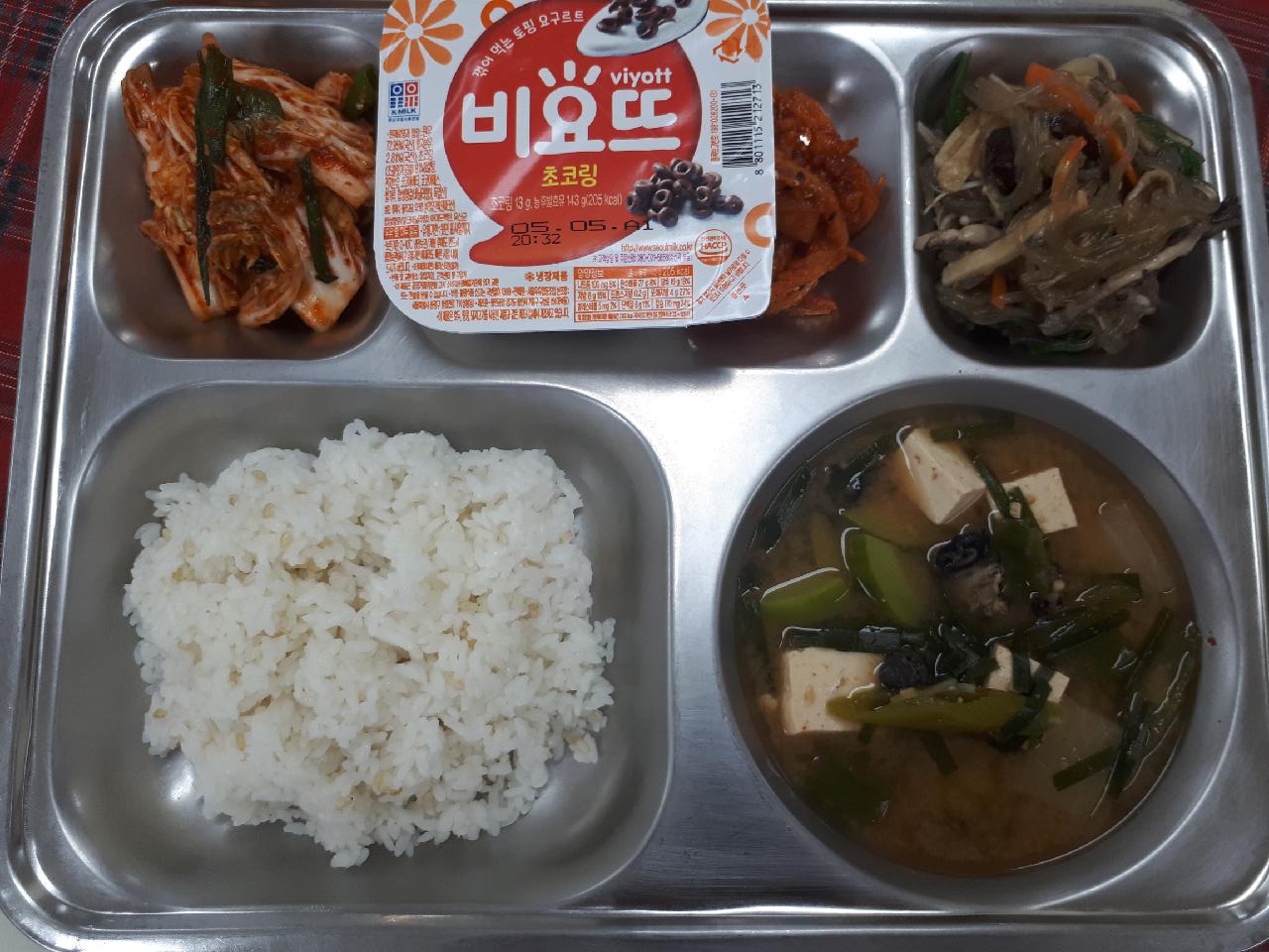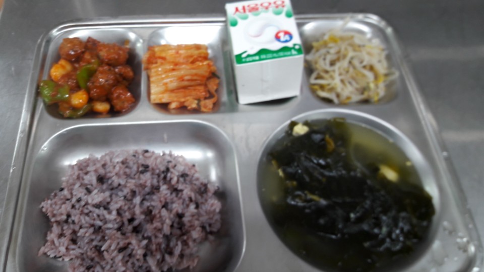 조식 : 흑미밥, 닭고기미역국, 삼채미트볼케찹볶음, 숙주나물, 배추김치, 우유