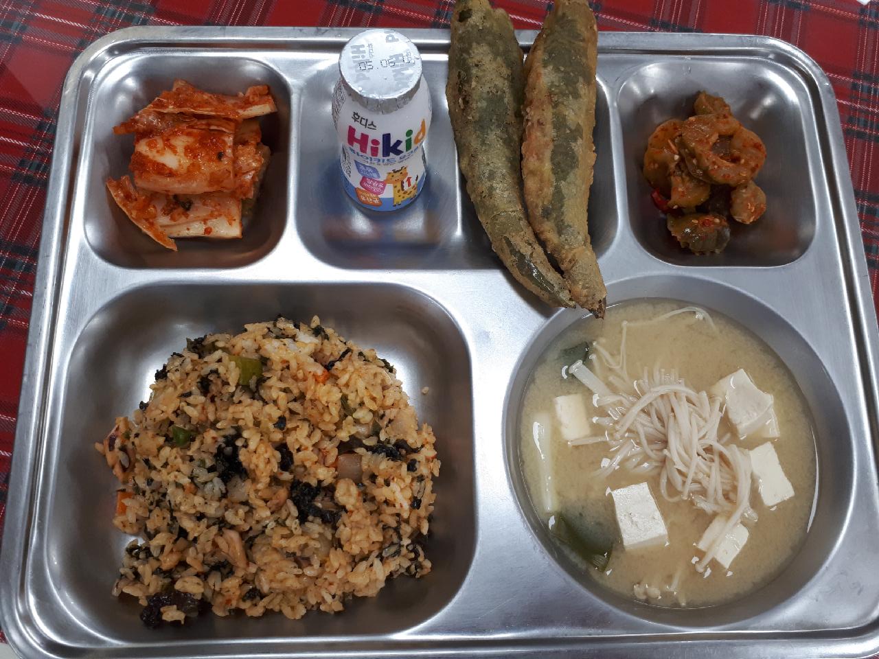 석식 : 짬뽕볶음밥, 팽이버섯미소국, 오이장아찌무침, 배추김치, 고추튀김, 이오