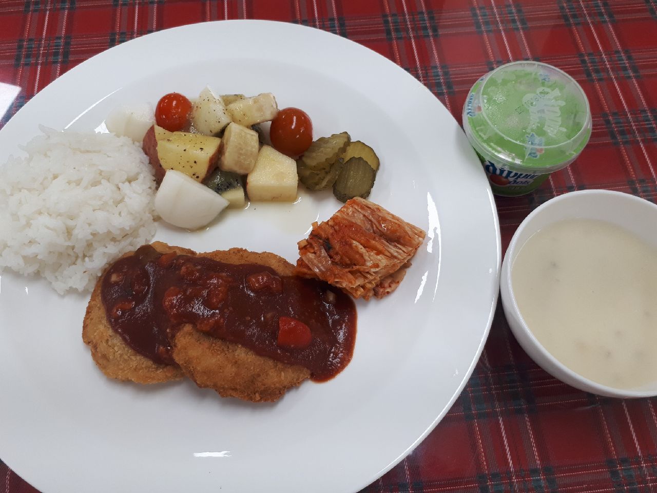 중식 : 흰밥, 치즈돈까스/파마산소스, 옥수수크림스프, 과일샐럿/키위소스, 오이피클, 배추김치, 구슬아이스크림