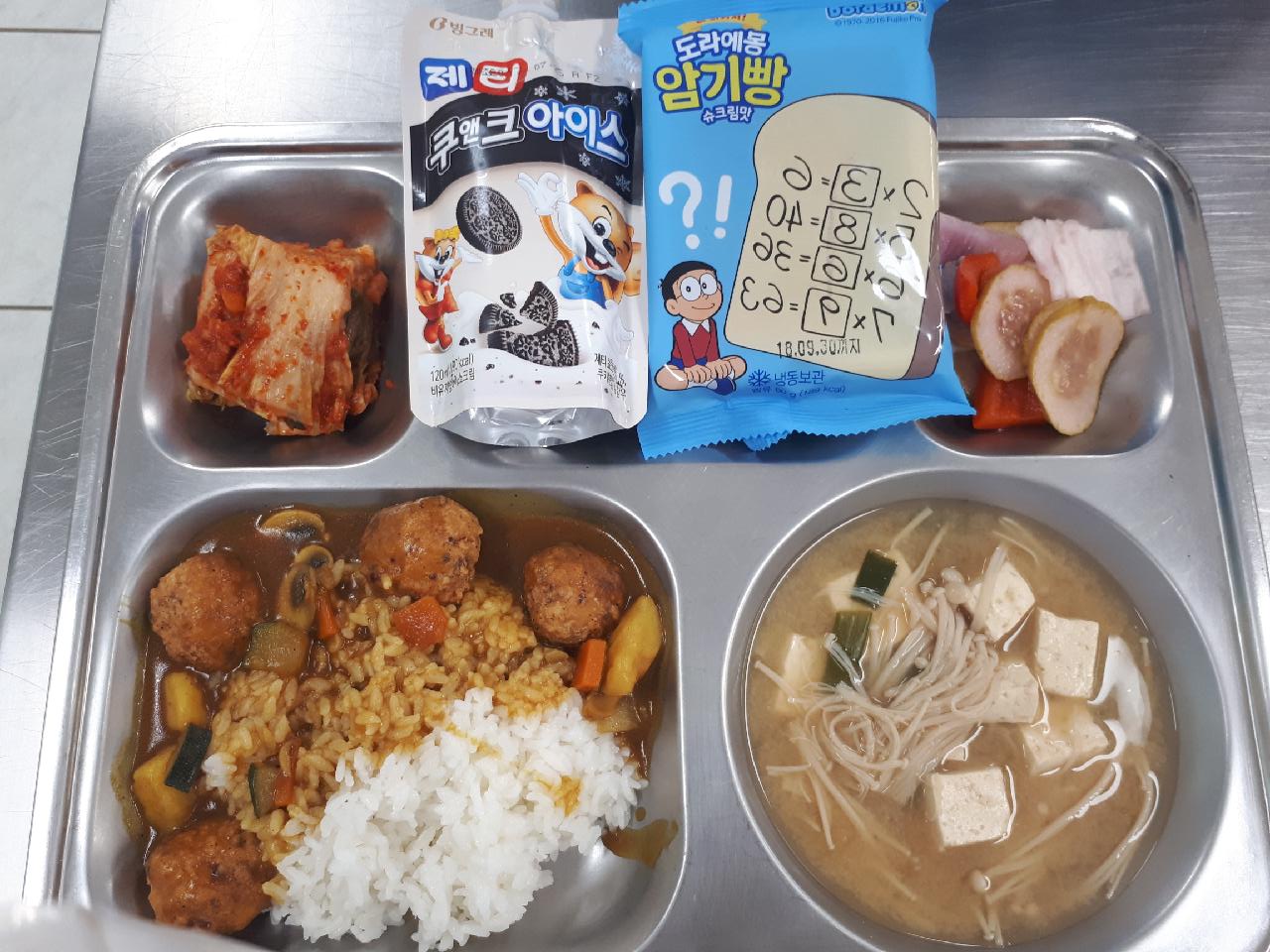 중식 : 치킨볼데미커리덮밥, 팽이버섯미소국, 야채아삭피클, 배추김치, 암기빵, 제티