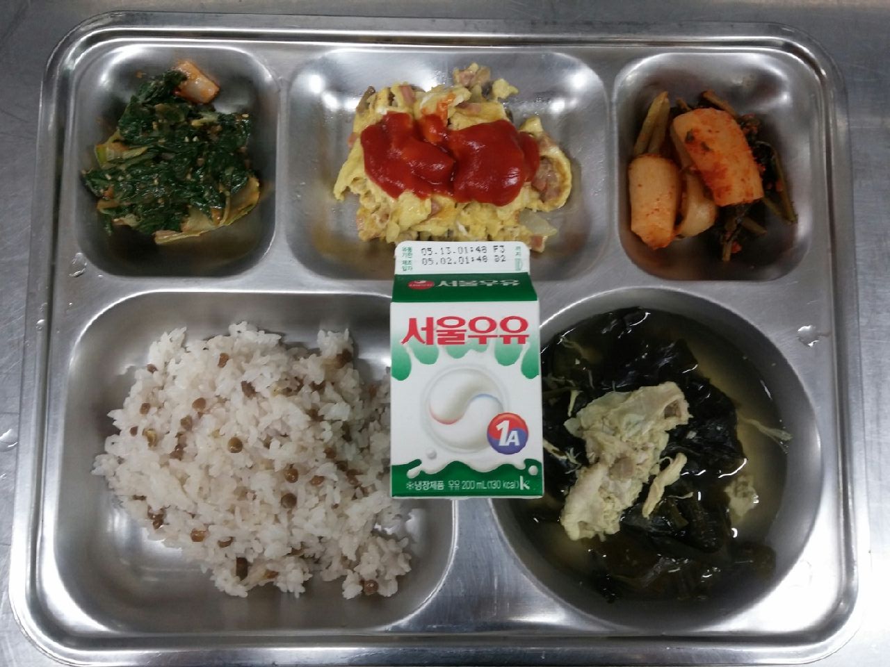 조식 : 렌틸콩밥, 닭고기미역국, 양송이스크램블/소스, 근대나물, 총각김치, 우유