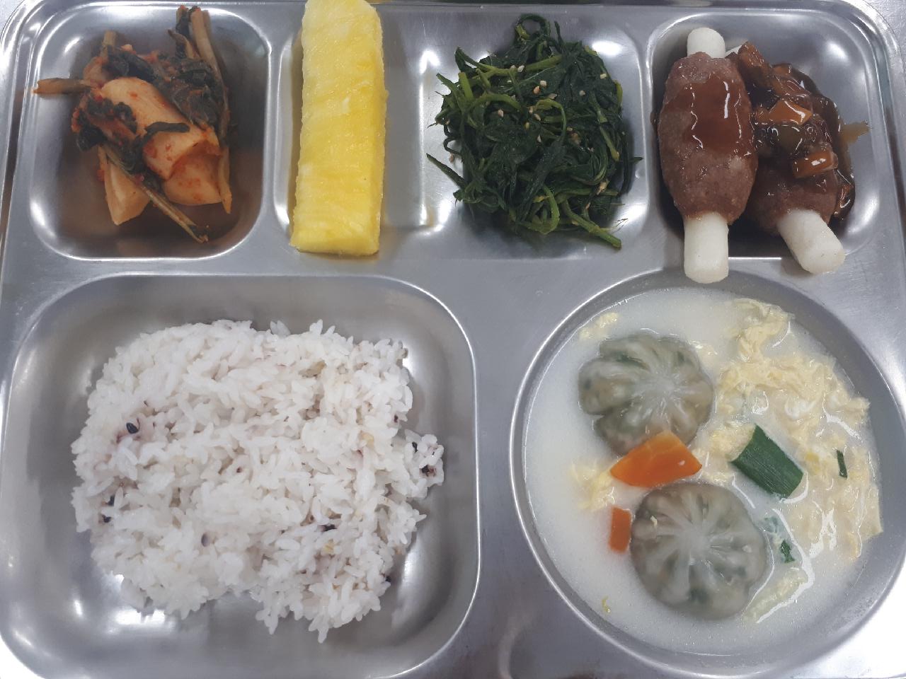 중식 : 혼합잡곡밥, 감자만두국, 떡심너비아니/소스, 취나물된장볶음, 배추김치, 골드파인애플