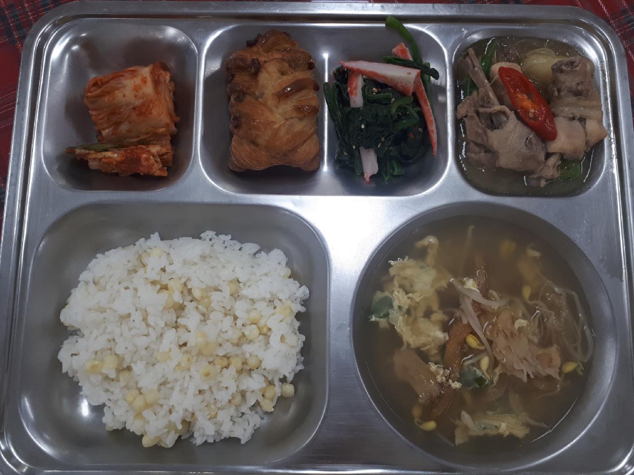 중식 : 옥수수밥, 황태콩나물국, 안동찜닭, 시금치맛살무침, 배추김치, 미니메이플피칸파이
