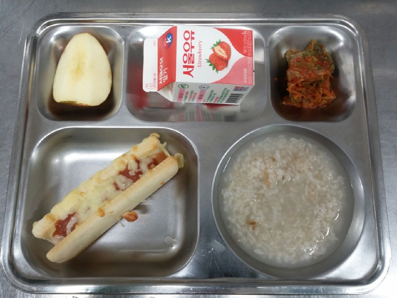 조식 : 소세지U번, 사과, 딸기우유, 숭늉, 배추김치