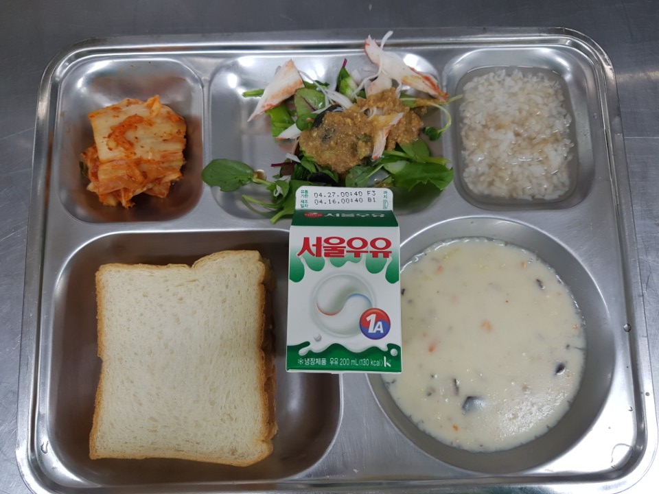 조식 : 식빵/쨈, 야채크림스프, 계란후라이, 베이비야채크래미샐럿, 우유, 숭늉/배추김치
