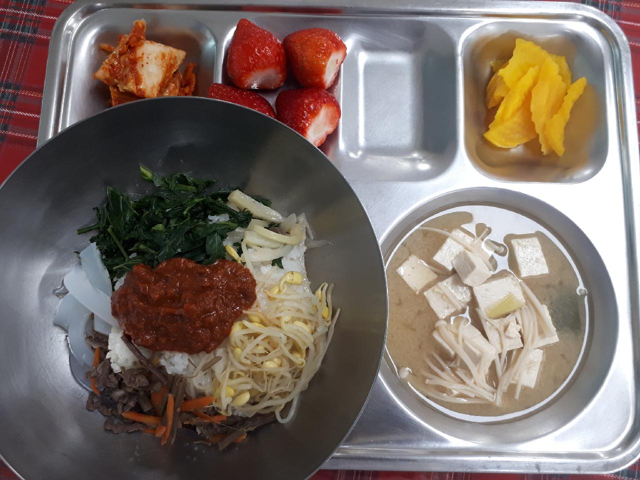 중식 : 전주비빔밥/소고기양념볶음고추장, 팽이버섯미소국, 단무지, 배추김치, 딸기