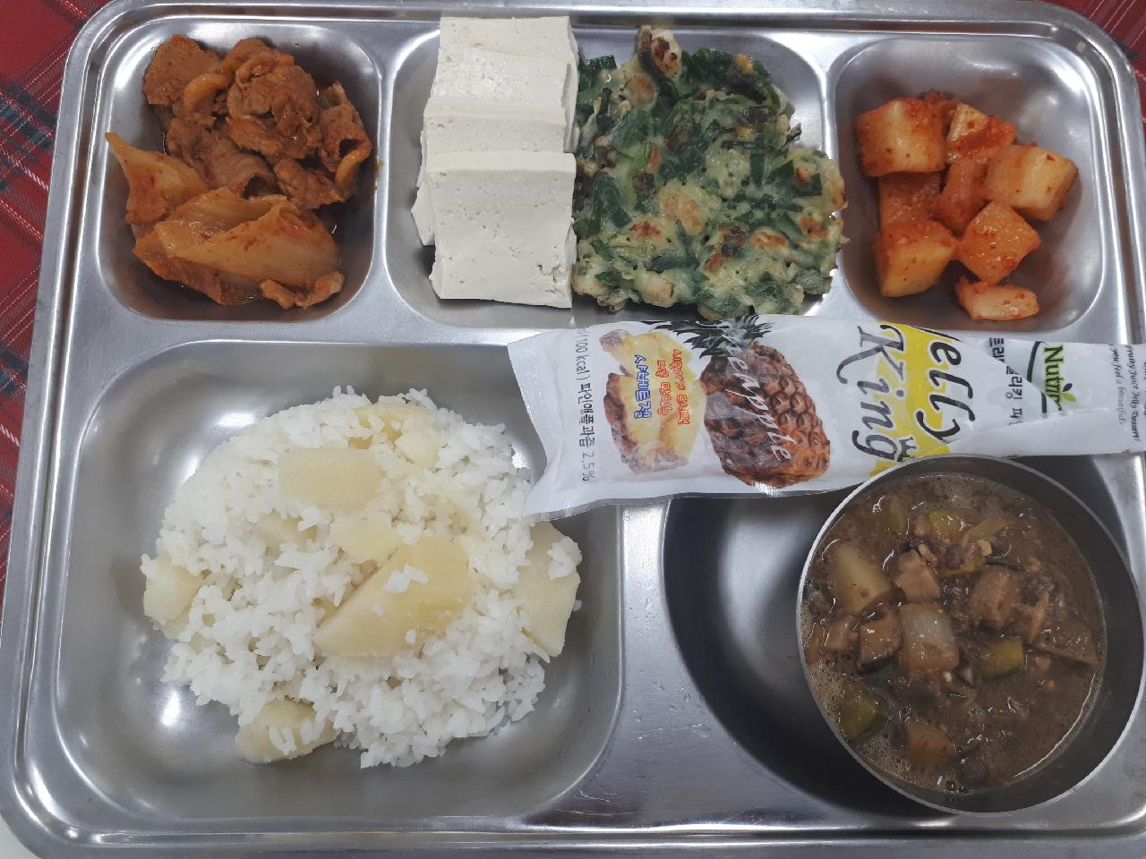중식 : 감자밥, 강된장찌개, 돈육김치볶음/온두부, 해물부추전, 깍두기, 젤리킹슬러쉬