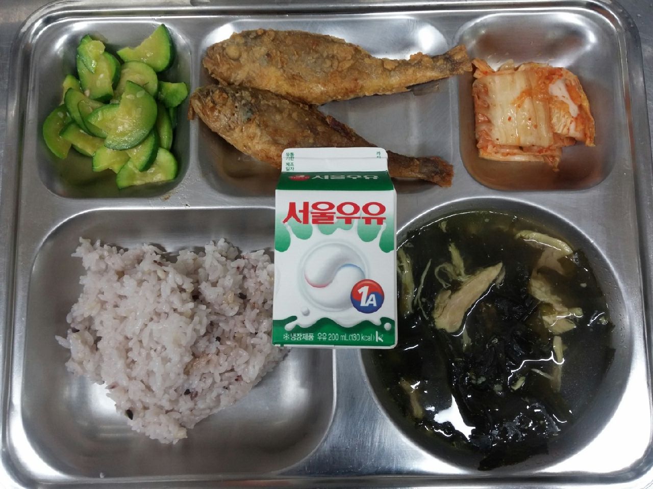 조식 : 혼합잡곡밥, 닭고기미역국, 조기구이, 호박나물, 배추김치, 우유