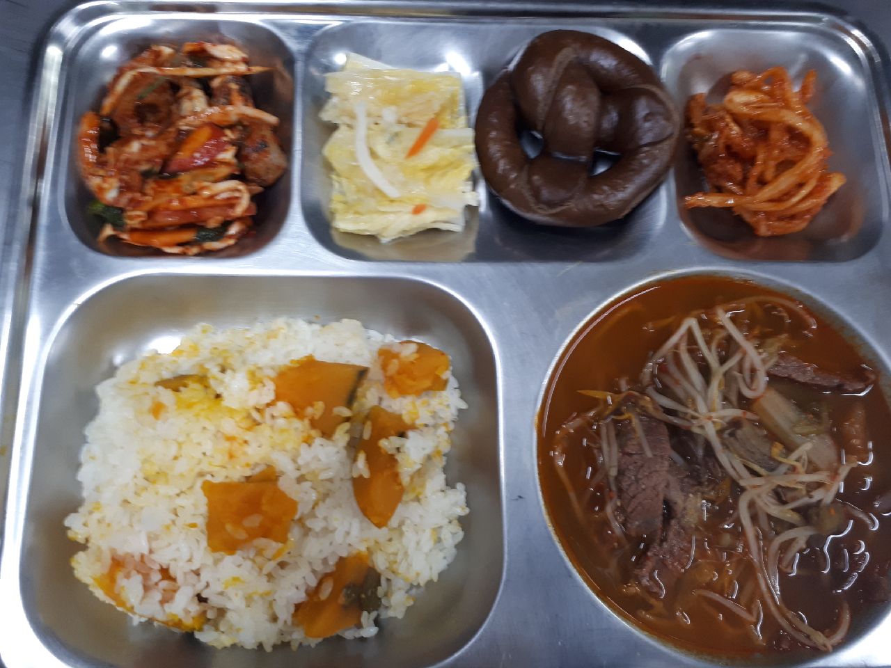 중식 : 단호박밥, 육개장, 골뱅이사과무침, 도라지엿장조림, 백김치, 미니초코프레즐
