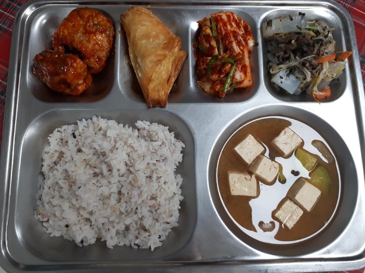 석식 : 혼합잡곡밥, 우렁된장찌개, 코다리북어강정, 탕평채, 겉절이, 소시지데니쉬